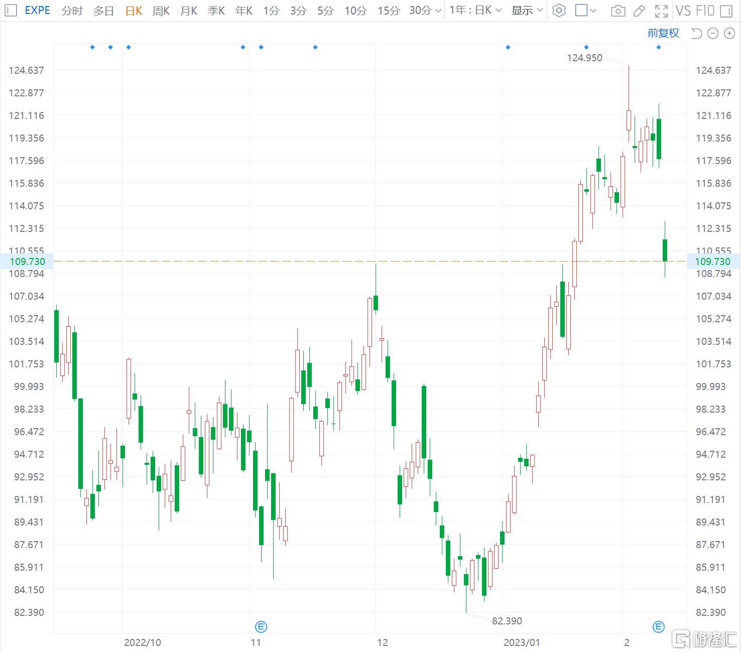 格隆汇2月10日丨Expedia(EXPE.US)跌6.47%,报110.09美元,总市值171.43亿美元。旅游预约平台Expedia(EXPE.US)公布上季业绩,期内录得1.77亿美元纯利,同比跌36%;收入同比升14.9%至26.2亿美元,低于市场预期的27亿美元;每股经调整盈利1.26美元,低于市场预期的1.67美元。2022年全年计,期内纯利录得3.52亿美元,而2021年亏损2.69亿美元;收入按年涨36%至116.7亿美元;每股经调整盈利6.79美元。