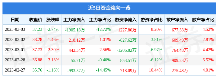 3月3日的资金流向数据方面,主力资金净流出1905.13万元,占总成交额12.72%,游资资金净流入1227.8万元,占总成交额8.2%,散户资金净流入677.33万元,占总成交额4.52%。